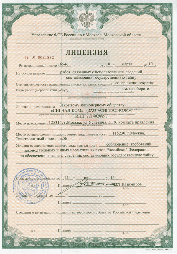 ![]() | ФСБ России Лицензия ГТ № 0021882, рег. № 16546 от 18.03.2010 г. на осуществление работ, связанных с использованием сведений, составляющих государственную тайну. |